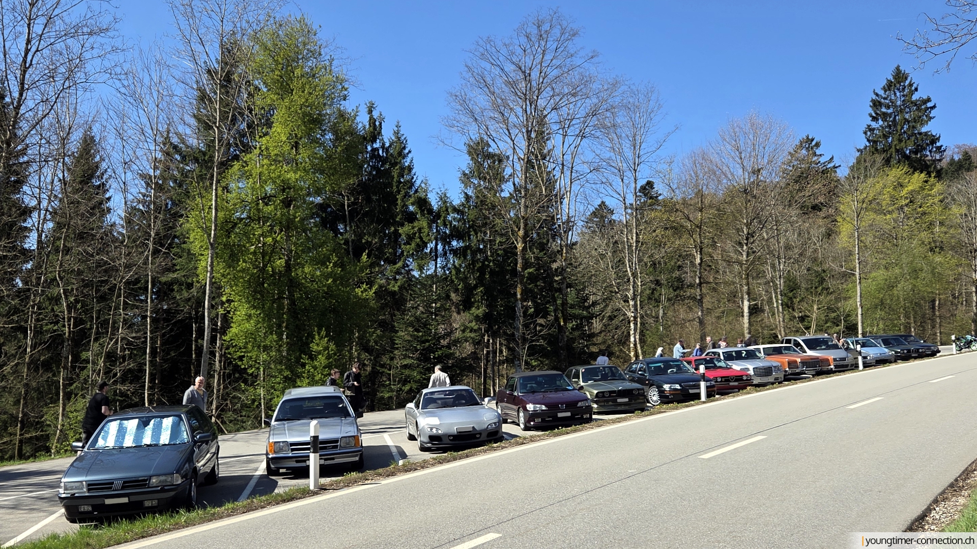 Bis zum Teilnahmeschluss gingen innerhalb kürzester Zeit 14 Anmeldungen ein. 20 Personen, bzw. 14 Youngtimer und Oldtimer fanden sich um 8 Uhr in der Früh am Treffpunkt in Aesch im Unterbaselbiet ein. Mit den Teilnehmerfahrzeugen wurde vom ältesten Auto mit Baujahr 1972 (Lincoln Continental Coupe) bis zum 2005er FIAT Multipla ein breites automobiles Spektrum abgedeckt. Auch Raritäten wie der 1992er Mazda RX-7 oder der BMW Alpina C2 2.7 waren mit von der Partie. Und wer erinnert sich noch an den Xedos 9 von Mazda oder an das Sparwunder VW Lupo 3L (welches nebenbei bemerkt sehr flink unterwegs sein kann 😉 )?